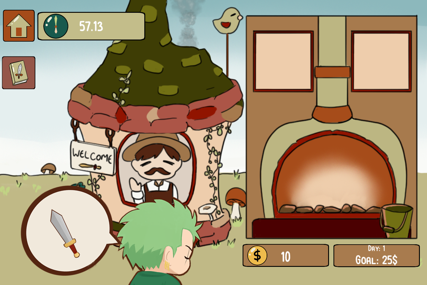 A farmer has a magical forge; he can use random items and turn them into weapons. He decided to open a small shack and sell them.